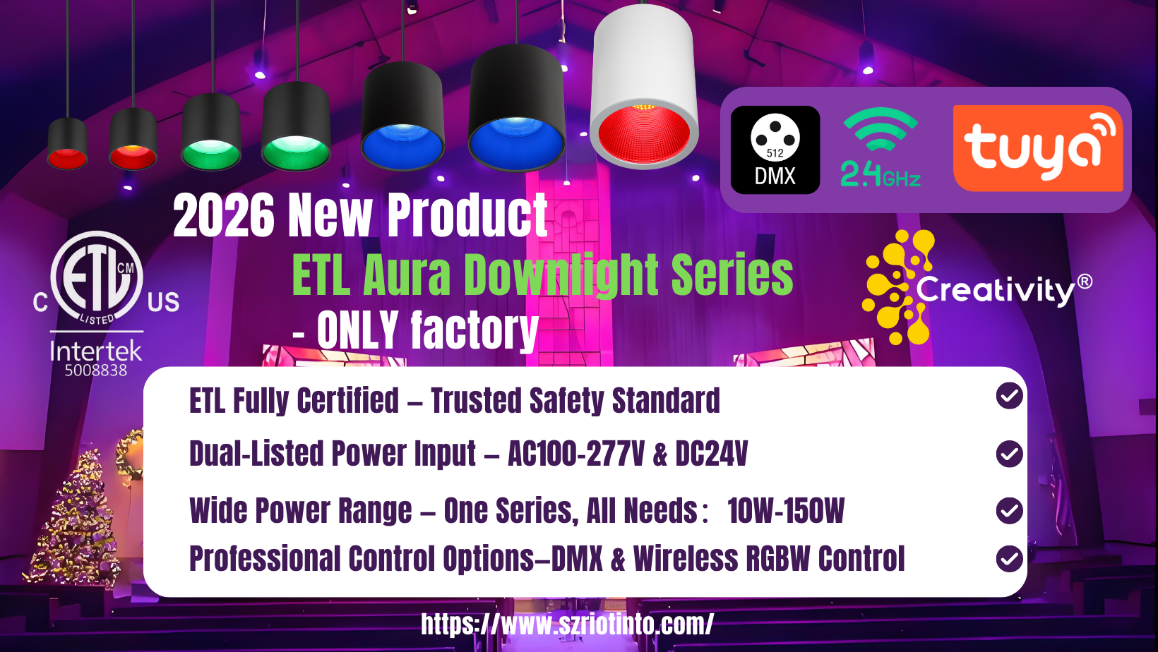 Rio Tinto high quality ETL Listed pendant LED downlight, DMX RGBW UFO high bay, wall washer, and other lighting solutions will enrich your life and buildings.